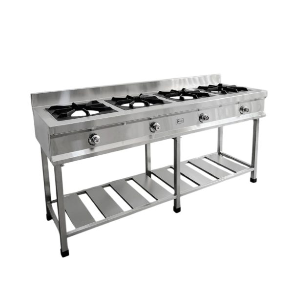 Cocina industrial de 4 hornillas en acero inoxidable, diseñada para alto rendimiento en cocinas profesionales. Versatilidad, resistencia y diseño a medida.